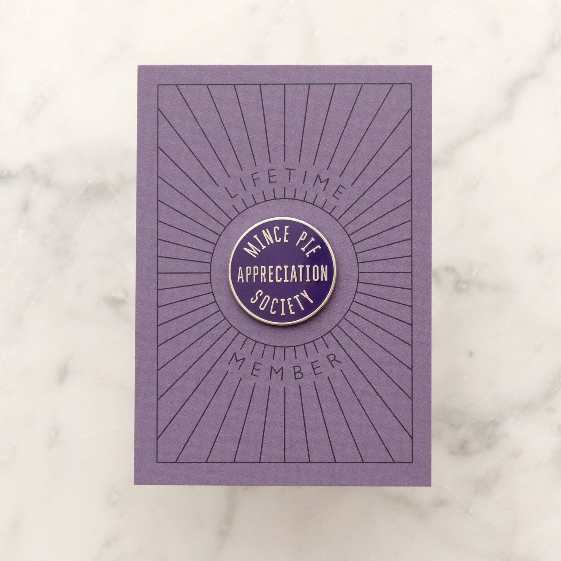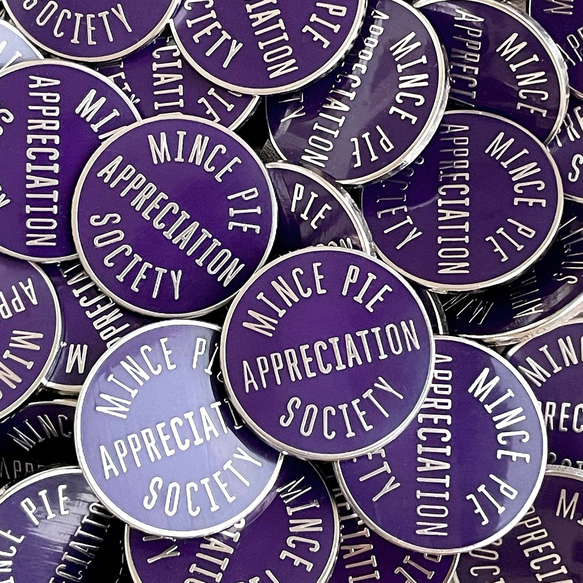 A lovely shiny pin, featuring our 'Mince Pie Appreciation Society' design. Made from a lovely deep purple hard enamel and silver toned metal with a rubber clasp.