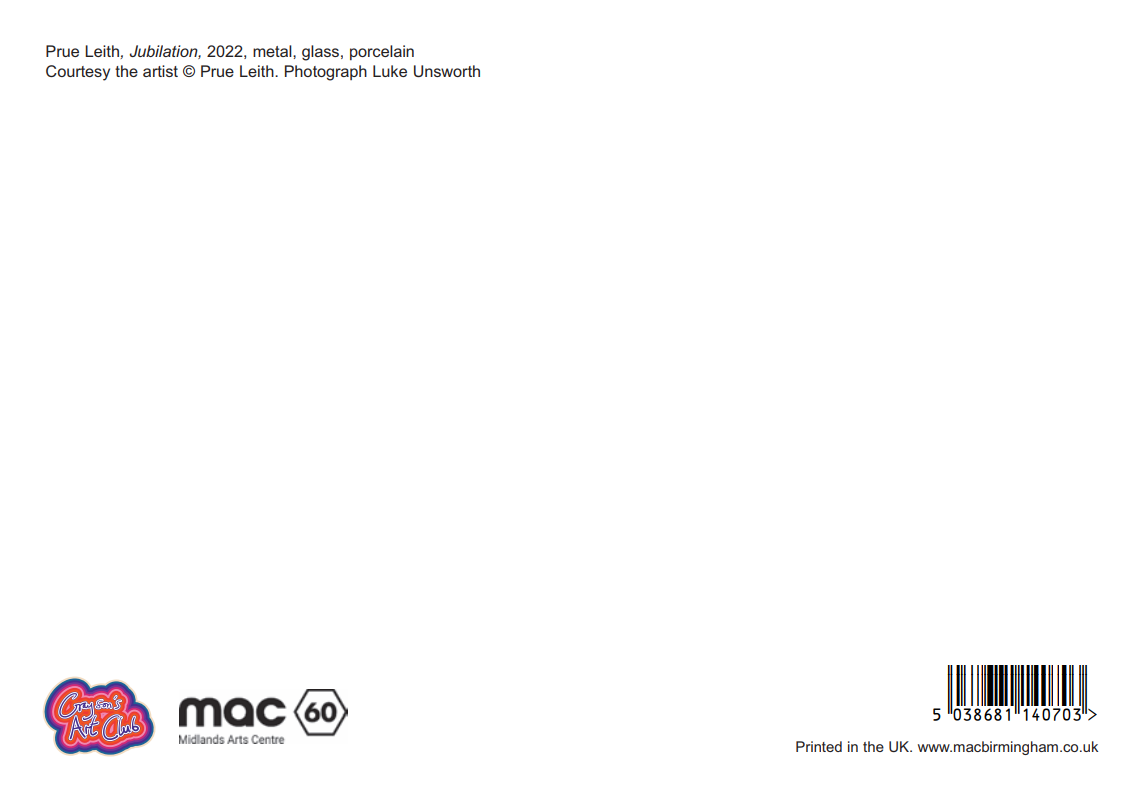This postcard features an image of Prue Leith's Jubilation (2022), an artwork on view in Grayson’s Art Club: The Exhibition at Midlands Arts Centre.