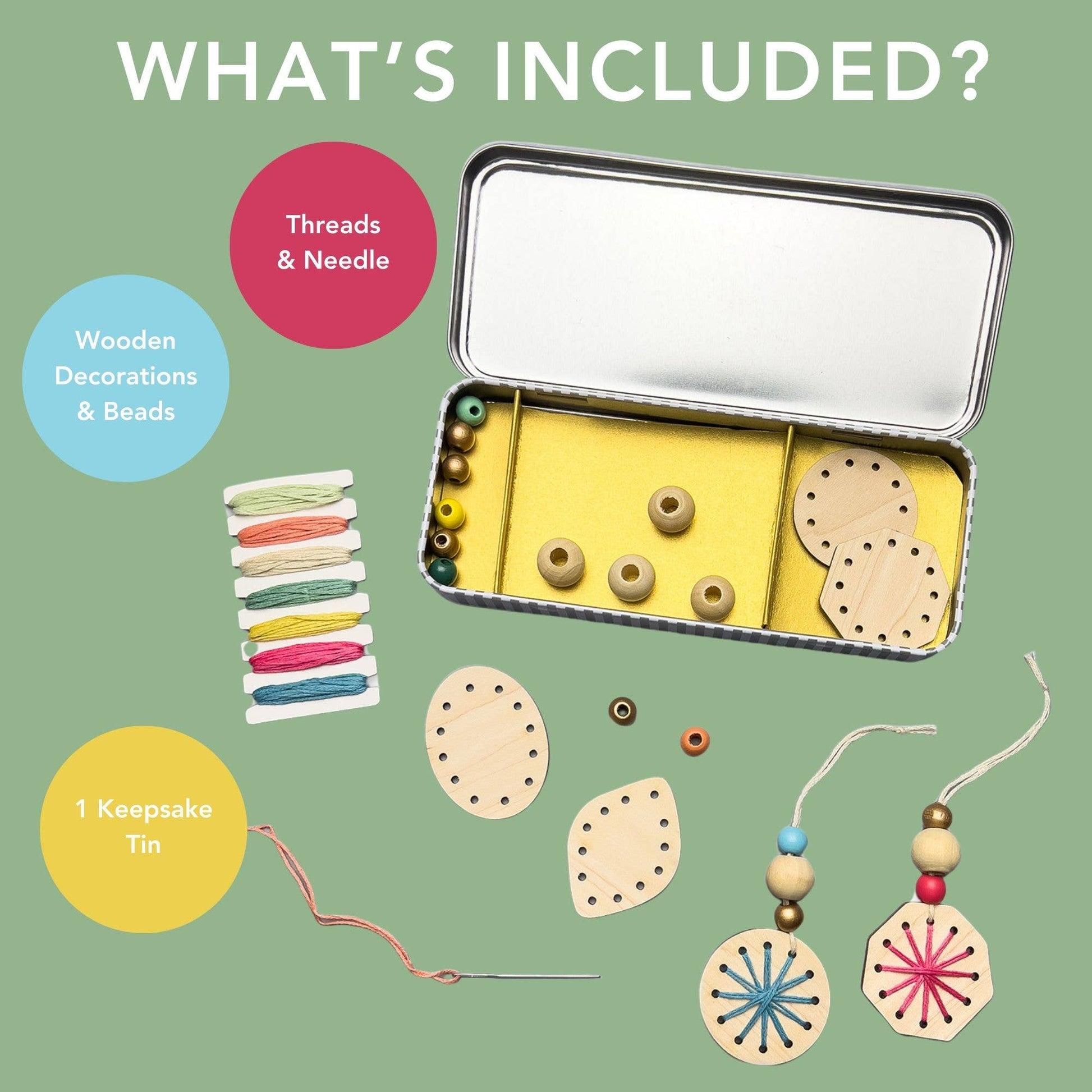 MATERIALS: plywood decorations, cotton threads, wooden beads, needle, tin, card